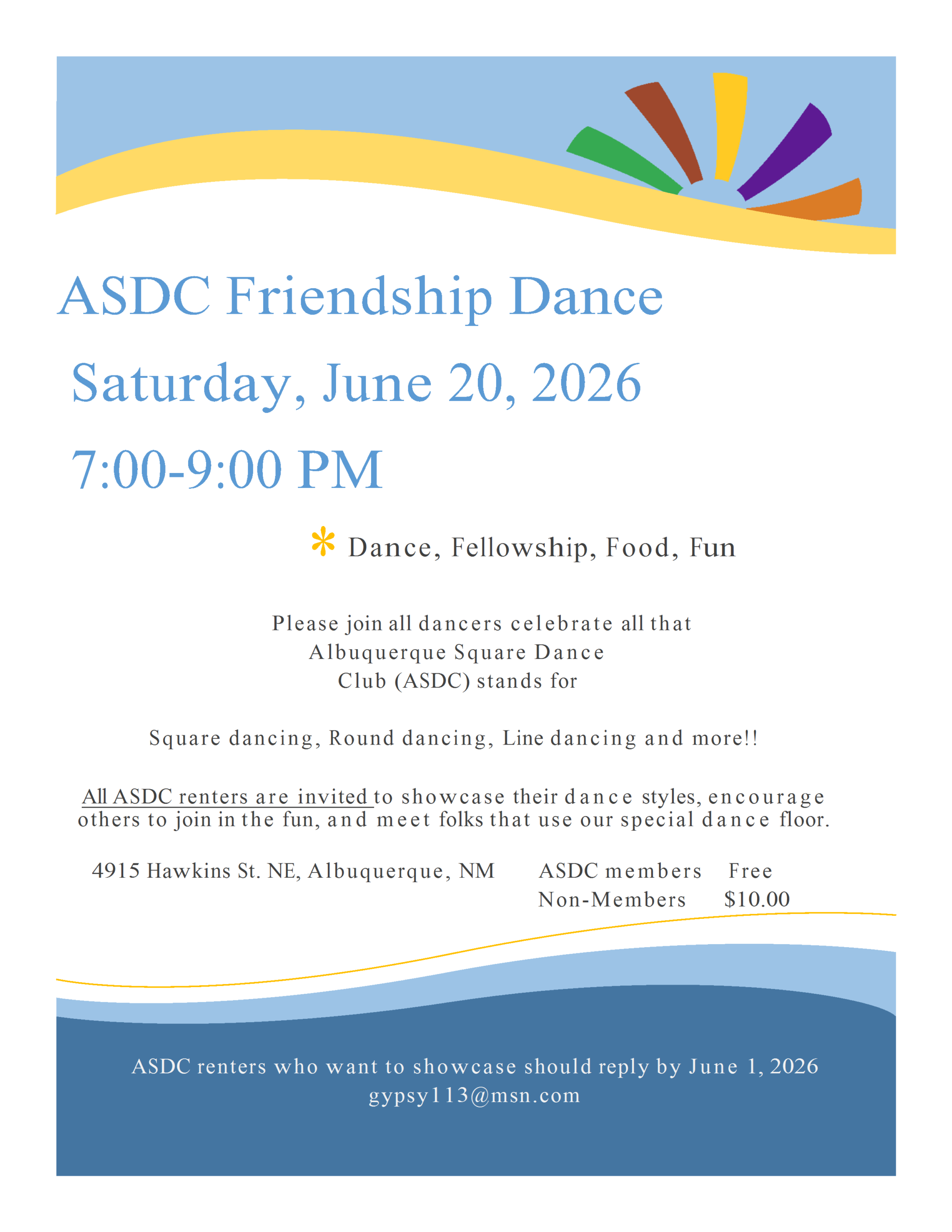 LARGE HALL: ASDC Friendship Dance Calendar Add to Calendar Add to Timely Calendar Add to Google Add to Outlook Add to Apple Calendar Add to other calendar Export to XML When: June 20, 2026 @ 7:00 pm – 10:00 pm 2026-06-20T19:00:00-06:00 2026-06-20T22:00:00-06:00 Special Dance West Hall